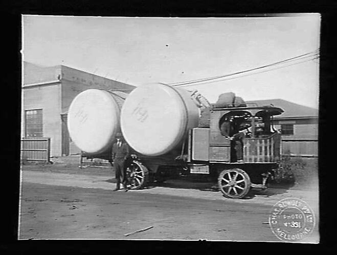 Two large metal buoys loaded on an undertype Sentinel steam wagon for delivery from Chas Ruwolt, 10 August 1928. Used to moor BPC phosphate ships at Nauru Island due to the lack of an anchorage or sheltered harbour. A long cantilever loading conveyor was employed to load rock phosphate used as the primary component of fertilizer in Australia.