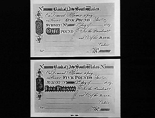 Illustrations of two, pound sterling bank drafts drawn on the Bank of New South Wales.
