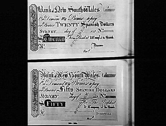 Illustrations of two, Spanish dollar bank drafts drawn on the Bank of New South Wales.