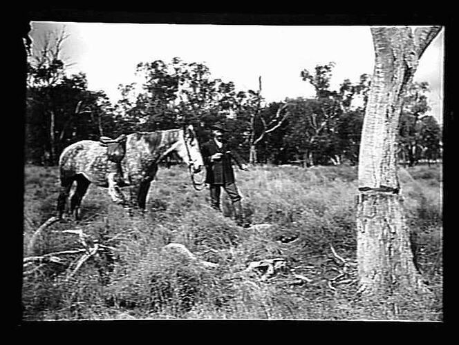 Man and horse near an emu nest and a ringbarked tree.