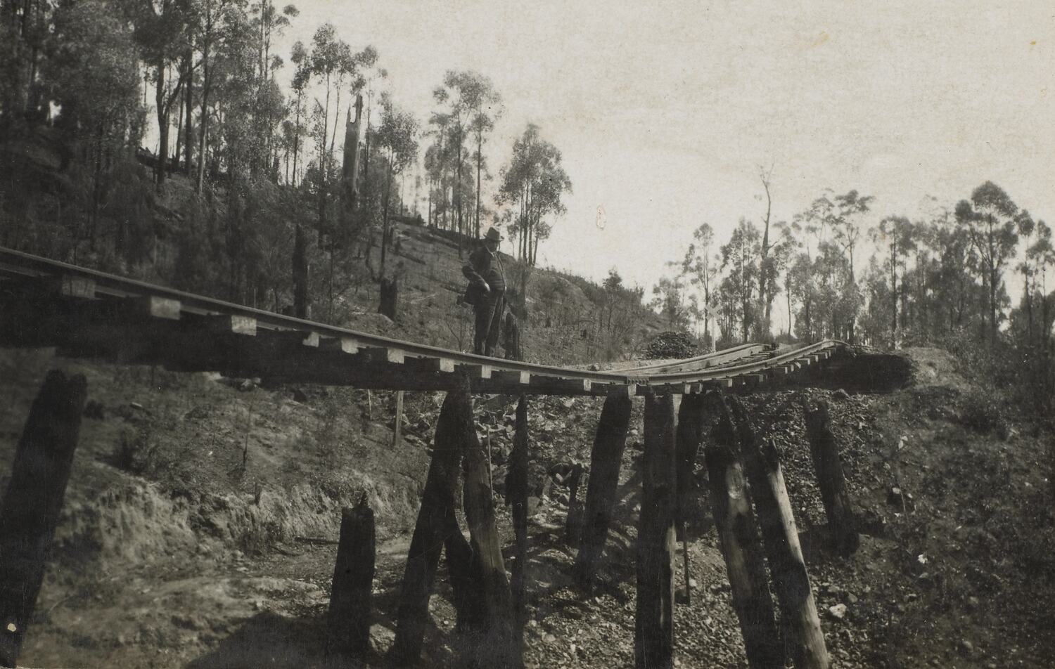 A man is standing on the bridge seen in CN132 after after bushfires have been through. The piers have been burnt through although the sleepers appear to have escaped the fire. The bridge was at 10m. 56c. (17.17km.) on the Warragul to Noojee line.