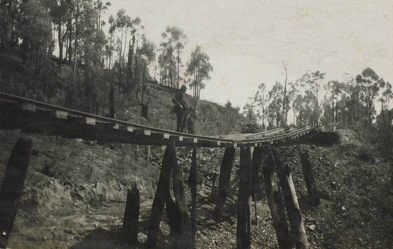 Photograph of Bridge over Road at 10m. 56c on the Neerim South to Toorongo River Line. The bridge has been damaged by bushfires Febuary 1926.