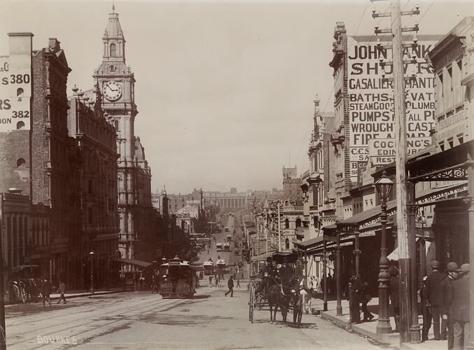 Black & white photograph of Bourke Street, Melbourne, looking east from Queen Street towards Spring Street, taken by the studio of Nettleton & Arnest, circa 1890.