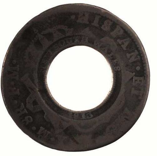 Overstruck around a circular hole cut from a Mexico Mint 8 Real coin, FIV[E + S]HILLINGS and a spray of olive leaves with the artist's initial H at its centre.. Around the rim of the original coin CAROLUS IIII DEI GRATIA 1793. This was the obverse of the host coin and featured a laureate bust of Charles IIII (mostly removed with the central dump) facing right.