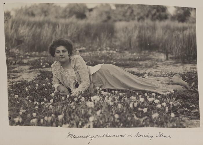Image of a reclining woman, taken by A.J. Campbell. From a photograph album containing 181 black & white and sepia toned photographs taken by Archibald James Campbell, ornithologist, during field trips to various parts of Australia. One of two albums covering these trips [see also HT 15824].