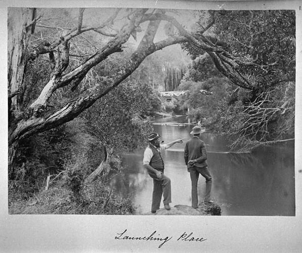 The upper reaches of the Yarra River. There are two men in the foreground and one is pointing towards the right.