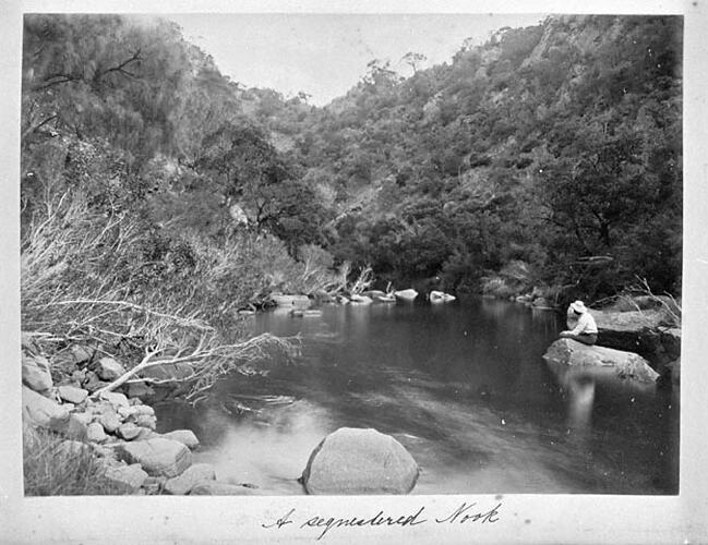 This image was taken by A.J Campbell on one of two camp outings with the Working Men's College Photogrpahic Club to Werribee Gorge in Nov 1895 and 1896. -