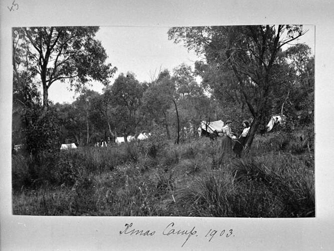 Image taken by A.J. Campbell on a family and friends Christmas camping trip to Lyterfield in 1903. The image is part of a Photograph album containing 181 black and white and sepia toned photographs taken by A.J. Campbell, ornithologist, during field trips to various parts of Australia. One of two albums covering these trips [see also HT 15824].