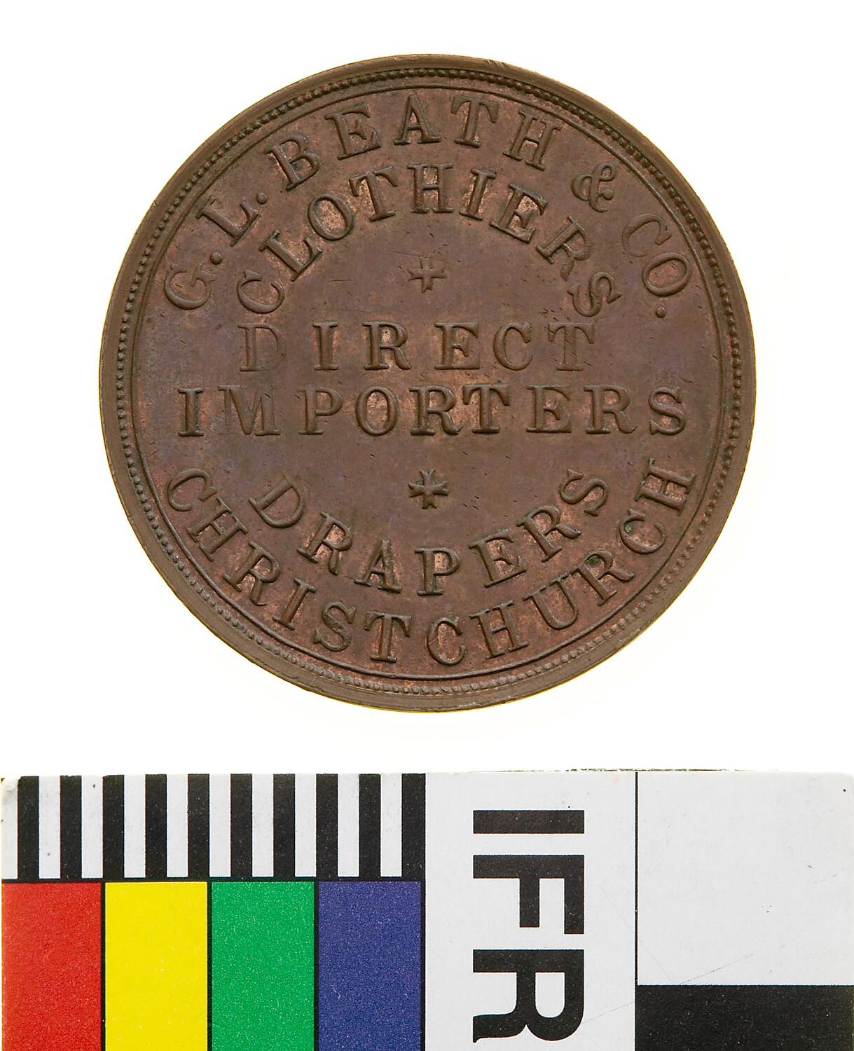 A round copper token (31 mm diameter). The piece features the name, address and business of the issuer: G.L Beath & Co., Argile House, Cashel Street, Christchurch, importers, clothiers and drapers. The reverse features a coat of arms with lion supporters. Stokes used whatever copper based metal they could find, these tokens may be bronze, brass or copper.