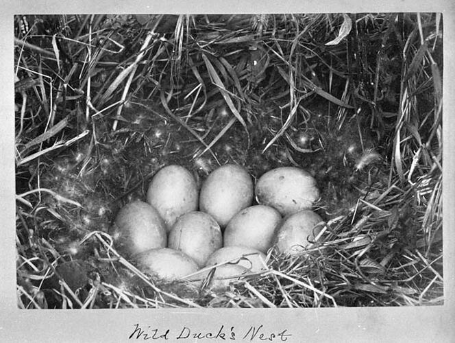 Nine eggs in the nest of a wild duck.