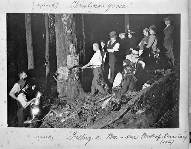 A flashlight photograph of a man cutting down a large tree. He is watched by a large group of people, one of whom is holding a lamp.