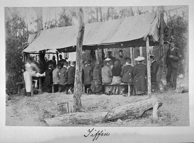 A large group of people seated under a canvas awning. A man in a white apron, presumably the cook, stands on the left pouring from a tea pot. There are two hurricane lanterns hanging from a beam beneath the awning.