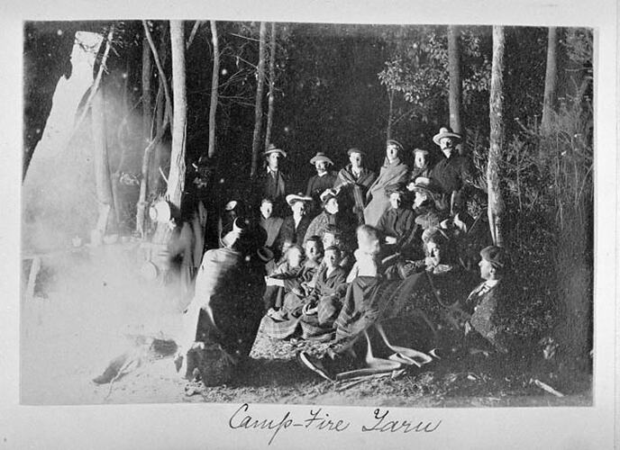 Image taken by A.J. Campbell on a friends and family Christmas camping trip to Ferntree Gully in 1905. The image is part of a Photograph album containing 181 black and white and sepia toned photographs taken by A.J. Campbell, ornithologist, during field trips to various parts of Australia. One of two albums covering these trips [see also HT 15824].