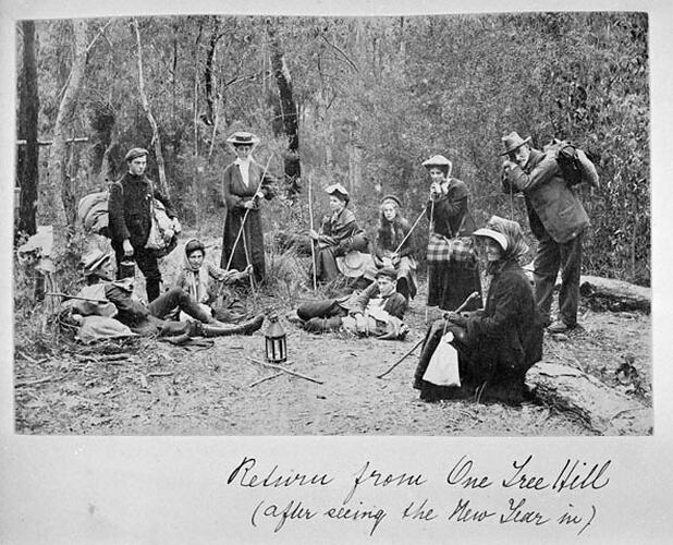 Image taken by A.J. Campbell on a friends and family Christmas camping trip to Ferntree Gully in 1905. The image is part of a Photograph album containing 181 black and white and sepia toned photographs taken by A.J. Campbell, ornithologist, during field trips to various parts of Australia. One of two albums covering these trips [see also HT 15824].