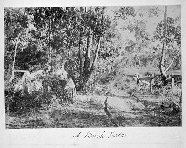 Image taken by A.J. Campbell on a friends and family Christmas camping trip to Ferntree Gully in 1904. The image is part of a Photograph album containing 181 black and white and sepia toned photographs taken by A.J. Campbell, ornithologist, during field trips to various parts of Australia. One of two albums covering these trips [see also HT 15824].