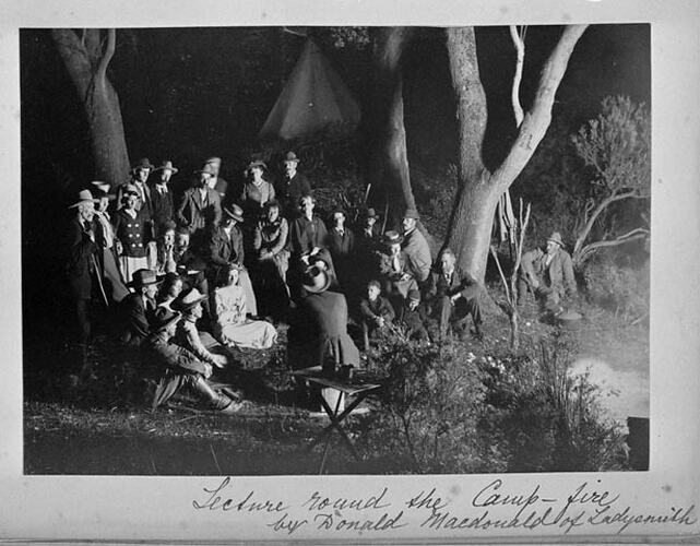 Image shows a group gathered to listen to a fire-side lecture by Donald MacDonald. It was taken by A.J. Campbell on a camping trip to Phillip Island with the Ornithology Union in November 1902. From a photograph album containing 181 black & white and sepia toned photographs taken by Archibald James Campbell, ornithologist, during field trips to various parts of Australia. One of two albums covering these trips [see also HT 15824].