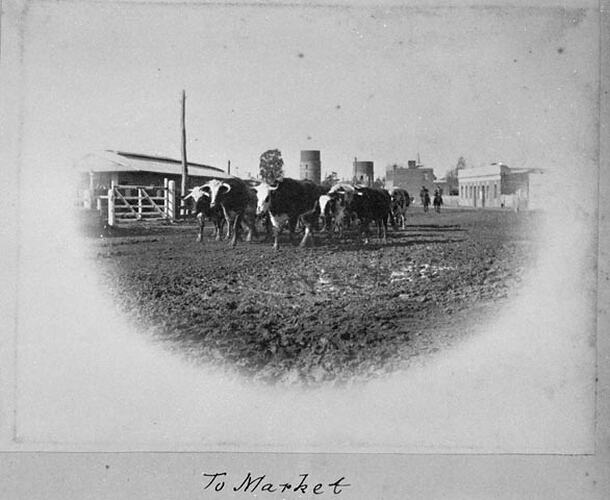 A herd of cattle in a town street. There are two horsemen in the background and two water towers in the distance.