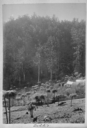 Looking down a slope to two small huts or houses in a bush clearing. There is a post and rail fence and a large number of whipstick fern trees. .