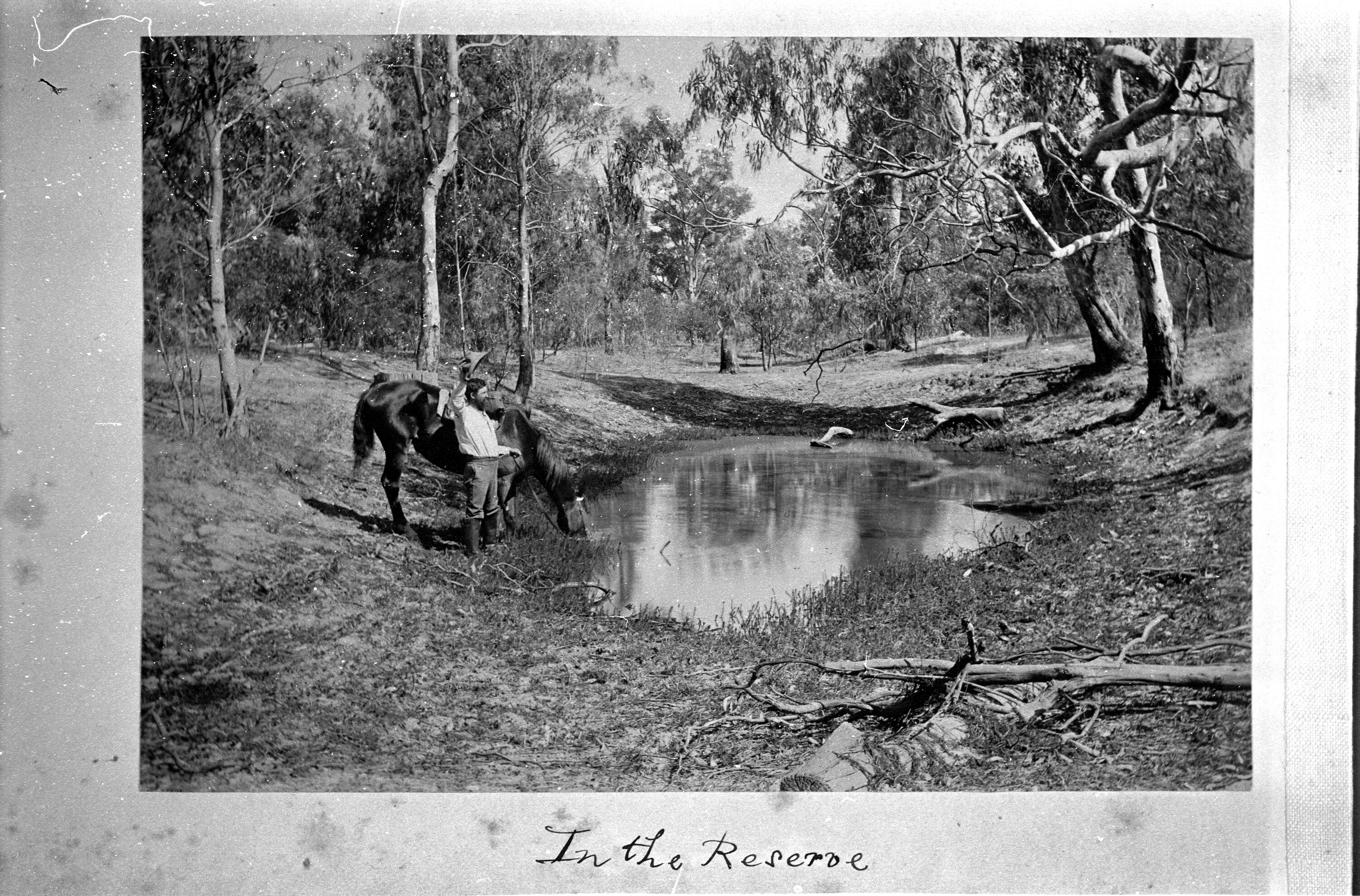 A man with a horse which is drinking from a water hole.