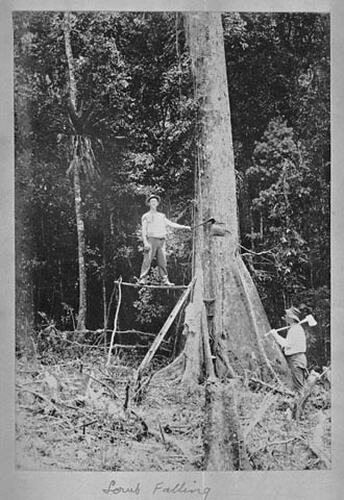 Felling a forest tree. One man is standing on a plank inserted in the tree and has his axe buried in the tree. The other man stands beside the tree with his axe on his shoulder.