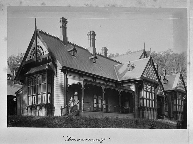 A large wooden house with shingled walls and roof. There are dormer windows in the roof, stained glass windows and an elaborate treatment of the gable ends. A man is standing at the top of the steps. Trees are visible beyond the house.