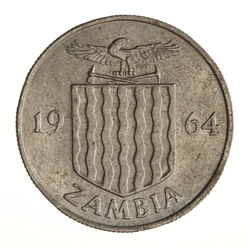 Coat of arms with eagle crest dividing the date 1964; below, ZAMBIA