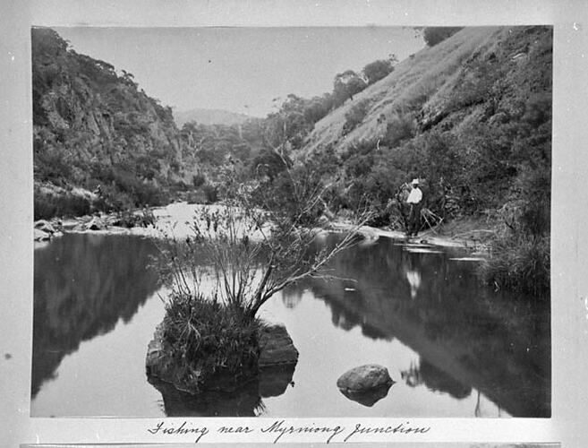 Image taken by A.J. Campbell on one of two camp outings with the Working Men's College Photographic Club to Werribee Gorge in November 1895 and 1896. The image is part of a Photograph album containing 181 black and white and sepia toned photographs taken by A.J. Campbell, ornithologist, during field trips to various parts of Australia. One of two albums covering these trips [see also HT 15824]
