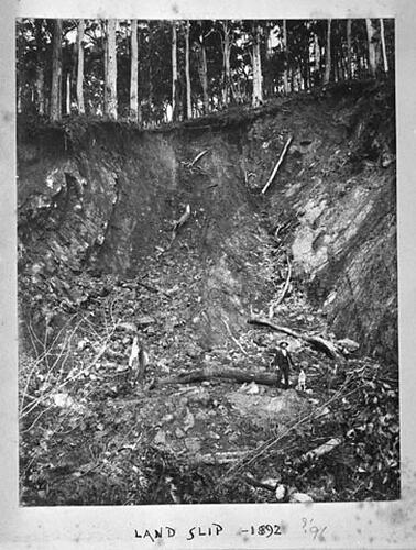 A land slip. Eucalypts are growing above the slip.
