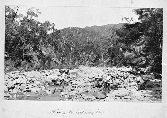 Two miners in the Lerderderg Gorge. The one on the left is operating a cradle while the one on the right is using a shovel, possibly to put rock into the pan behind him.