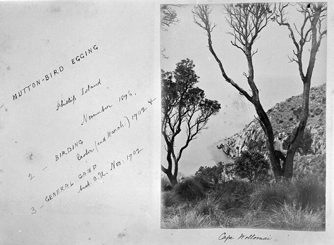 Image taken by A.J. Campbell on a Mutton- Bird Egging trip to Phillip Island in November 1896. The image is part of a Photograph album containing 181 black and white and sepia toned photographs taken by A.J. Campbell, ornithologist, during field trips to various parts of Australia. One of two albums covering these trips [see also HT 15824]