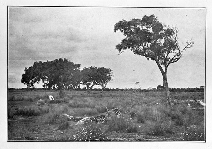 A landscape near Aspendale. Open grassland with a tree on the right and a cluster of trees in the background.