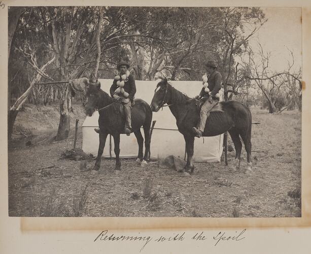 Two men on horseback at their camp. Each man carries strings of emu eggs across his shoulders.