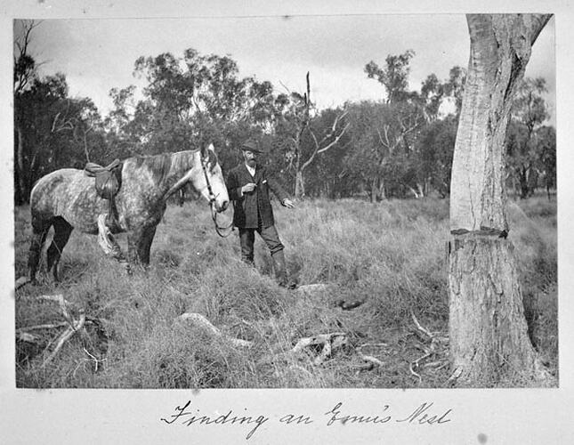 A man indicating an emu's nest in tall grass. He is leading a horse. There is a ring-barked tree on the right.