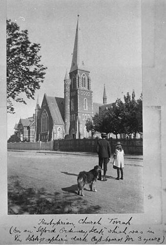 A young boy, a girl and a dog looking at the Presbyterian Church. (This image also appears at MM 70191).