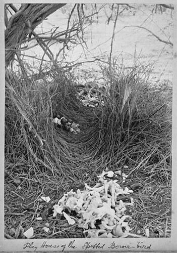 A bower-bird's nest with what appears to be a pile of small bones.