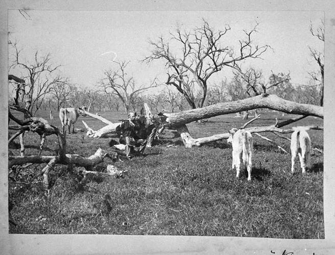 Image of a man sitting on a fallen dead tree, playing the flute, taken by A.J. Campbell. Part of a large collection of images depicting mainly aspects of the natural environment of south-eastern Australia, created by Archibald James Campbell between 1890 and 1915.