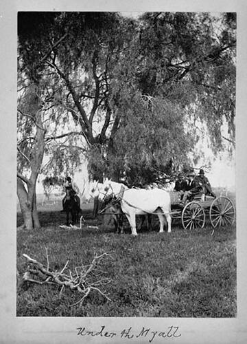 A man on horseback and three men in a horsedrawn buggy beneath trees.