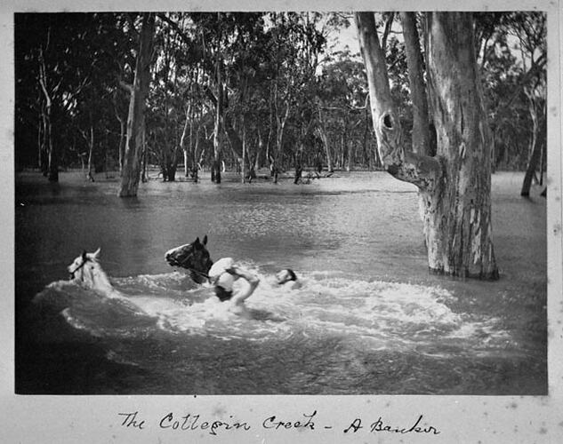 Two horses swimming across a flooded creek. There are two men swimming with the horses and the nearest one may be holding a bundle aloft.