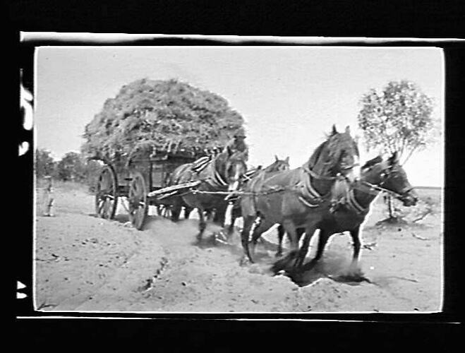 Black and white photographic negative by the photographer William (Bill) Boyd. The Bill Boyd Photographic Collection consists of 446 negatives on film and 56 photographs on paper depicting farming activities, family and the domestic life of people who settled the challenging wheat frontier of the Mallee, mainly in and around the towns of Nandaly & Sea Lake. The images were captured to highlight the vanishing pioneer atmosphere and to record agriculture techniques used during the 1920s. For detailed description of Boyd's life and work, see "Having a Go - Bill Boyd's Mallee" by Weston Bate, published in 1988. Most of the photographs were taken between 1920 & 1928. See separate records for detailed description of each negative. Descriptive data has been transcribed from interview with Bill Boyd in 1988.