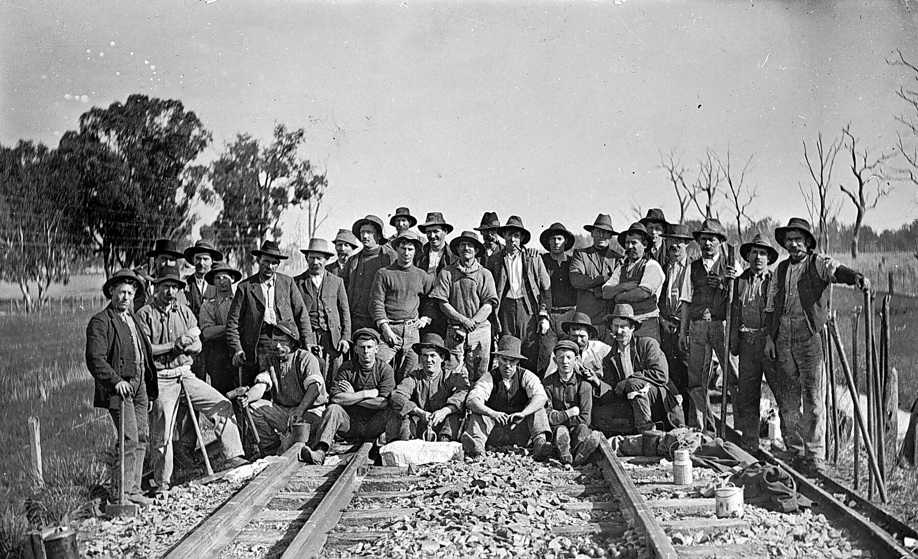 A group of Ways and Works Branch employees posed for a photo during maintenance work on the permanent way near Fernihurst. Several men hold tools and all wear hats. Loose sleepers lie either side of the railway line. There are dead trees in the paddock behind the men.