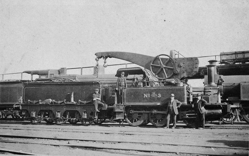 Victorian Railways steam breakdown crane locomotive No.3 (also known as 'Polly' or Tank Locomotive No.Z-526) with six-wheel tender. The locomotive is standing in a siding or railway shunting yard. There are four men sanding around the engine, and two larger locomotives are in the background. There is a goods truck on an overhead bridge or coal stage in the background.