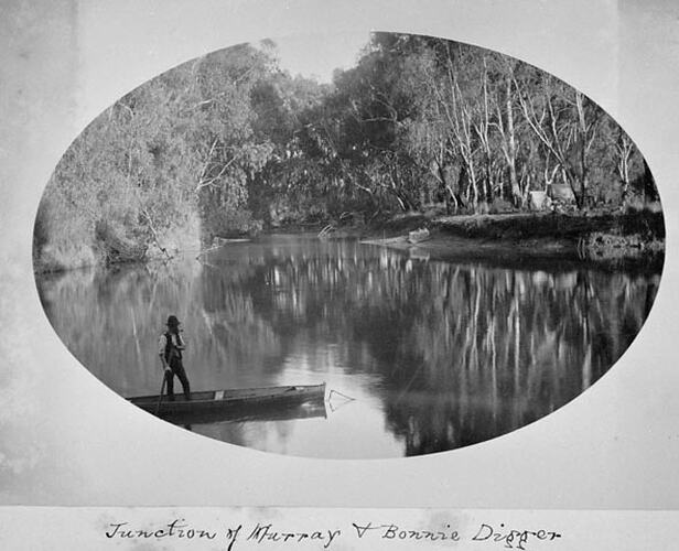 A man standing in a boat on the Murray River at its junction with the Bonnie Digger.