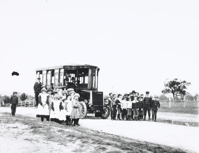 Victorian Railways No.1 Steam Bus parked on an unsealed rural road in undulating open farm country. A group of approximately 30 school children of various ages pose in front of the bus with the girls all grouped on the left and the boys grouped on the right. Most of the children are wearing hats or caps and most of the girls are wearing white pinafores over their dresses while some of the younger boys have wide white collars. A single boy stands on his own at the rear and three men.
