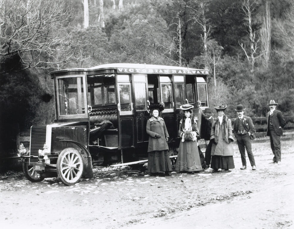 Victorian Railways No.1 Chelmsford steam bus parked in front of a post and rail fence on the side of an unsealed forest range. A group of three men and three women on an excursion pose in front of the bus. The body of the steam bus was built by the Newport Railway Workshop. Six of these vehicles were ordered but they served for only a short period after proving unreliable in service. They were used primarily as feeder services to railway stations on the St Kilda-Brighton route.