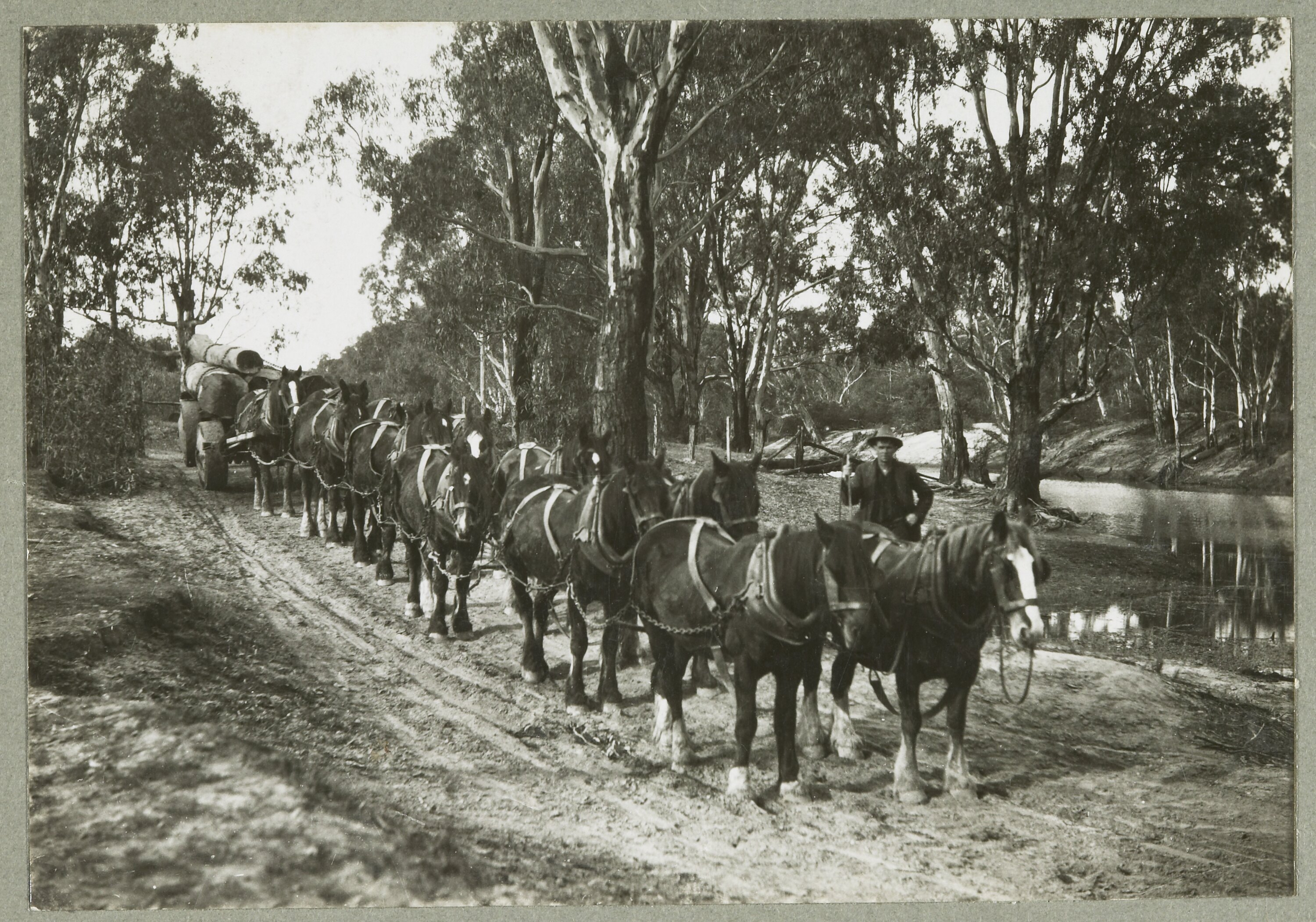 A twelve-horse team hauling a jinker loaded with red gum piles on a dirt track running alongside the Murray River. The teamster is standing in the background.
