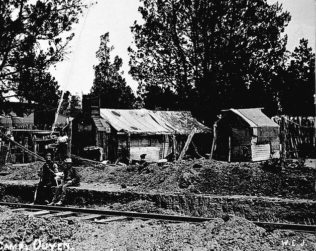 Two men seated on a small railway cutting. Their camp is behind and the huts are constructed form corrugated iron with sacking roofs,.