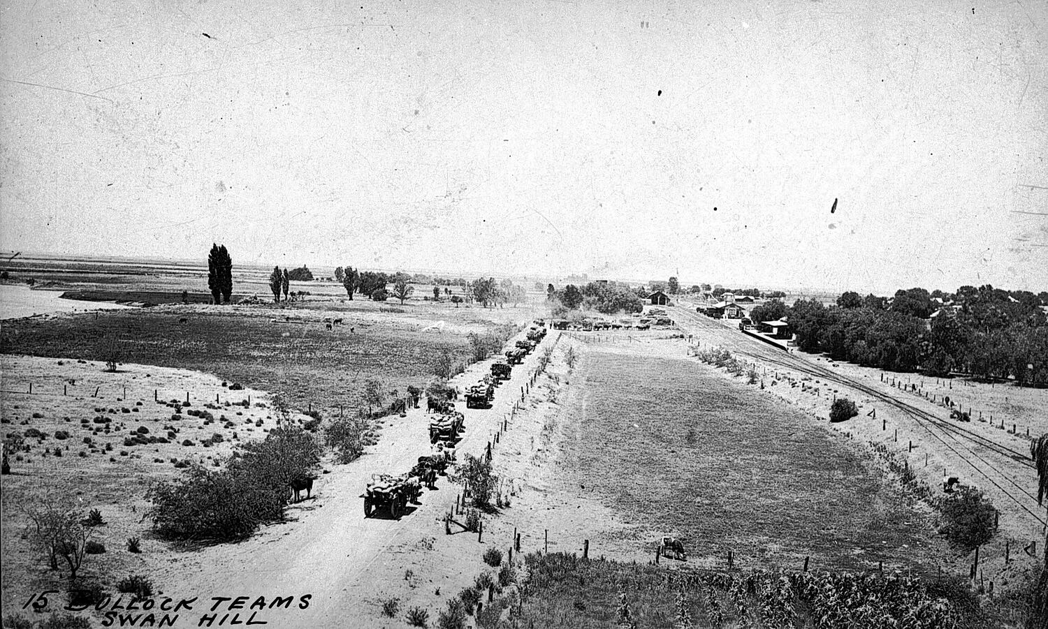 Looking down on a number of bullock teams. Swan Hill is in the background.