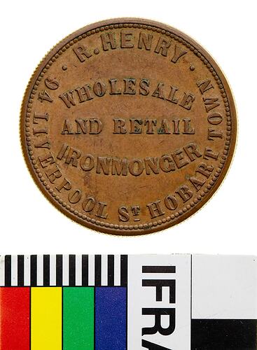 Legend in five lines with first and last curved around the rim: R. HENRY / WHOLESALE / AND RETAIL l IRONMONGER / 96 LIVERPOOL ST. HOBART TOWN