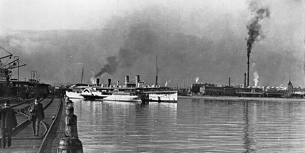 Looking northwards along Sandridge (Port Melbourne) Railway Pier during the evening. Two men walk along the railway lines on the pier. Two paddle steamers are berthed at the northern end of the pier. Smoking factory chimneys are visible in the background.
