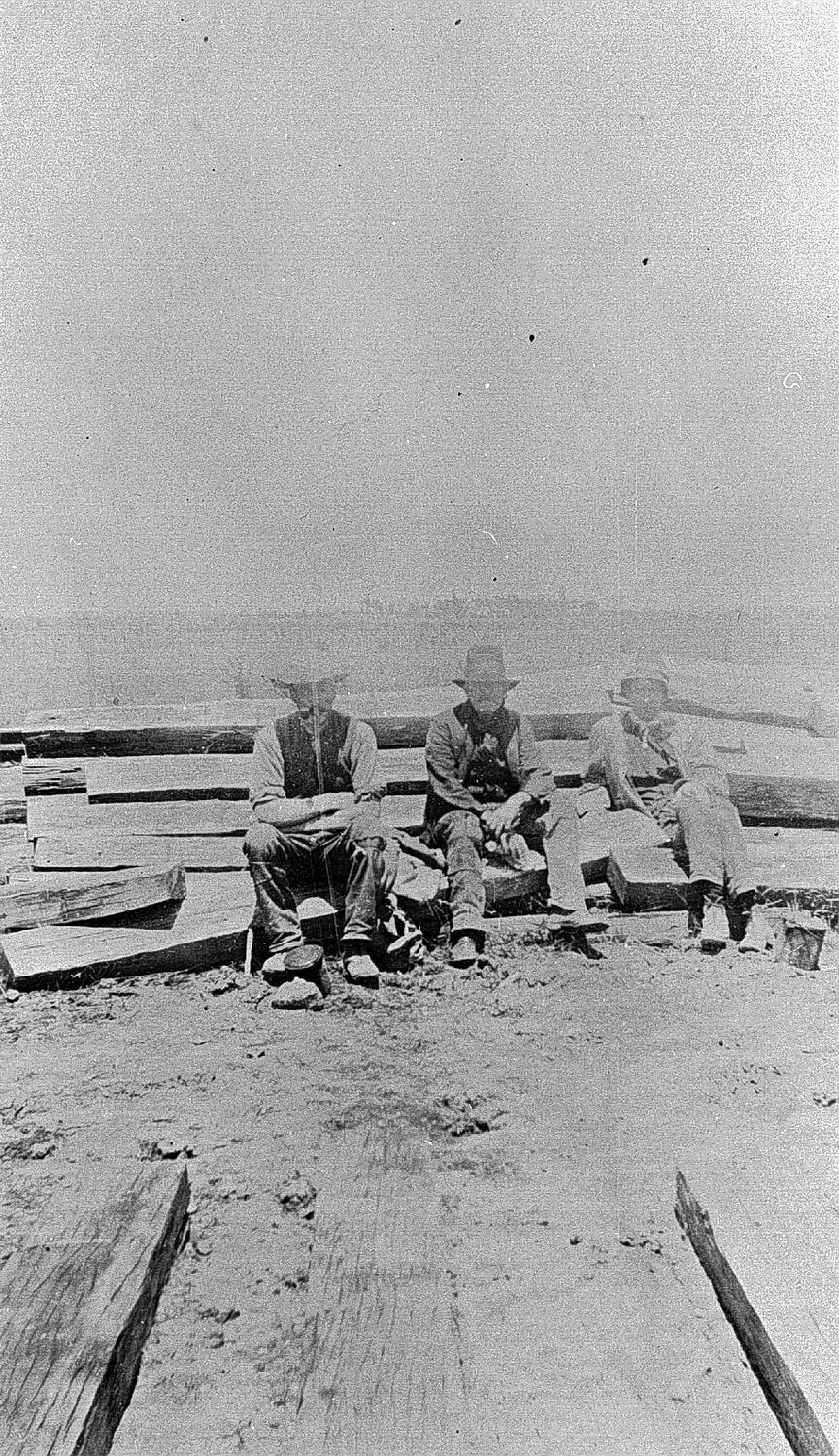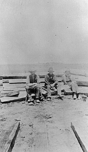 Three men seated on a stack of railway sleepers. There are some sleepers in the foreground that appear to be deliberately arranged - this may have been during the construction or repair of a railway line.